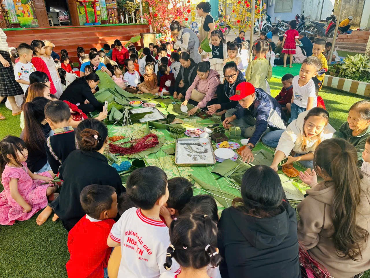Với chủ đề “Bé vui đón tết”, xuân Bính Ngọ 2026 trường Mẫu giáo Hoa Sen đã tổ chức nhiều hoạt động vô cùng phong phú, hấp dẫn, mang đậm bản sắc dân tộc như: Tặng quà các học sinh có hoàn cảnh khó khăn, vui liên hoan văn nghệ với các bài hát, múa sôi nổi về chủ đề “Tết và mùa xuân”. Đặc biệt, dưới sự hướng dẫn, đồng hành của các cô giáo và các bậc phụ huynh học sinh, các con đã được thực hành trải nghiệm “Gói bánh chưng” được tự tay dùng các nguyên liệu để thực hiện các thao tác gói bánh chưng, có sự gợi ý, hướng dẫn của các cô giáo và phụ huynh. Các con đã được thực hành với các hoạt động như: Lau lá dong, gấp lá, xúc gạo, nắm đỗ xanh, thái thịt lợn, cùng buộc lạt, gói bánh và cùng nhau ngồi quanh bếp để luộc bánh chưng…