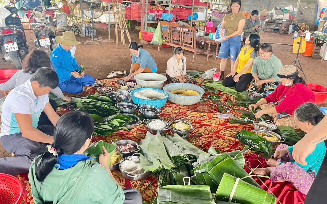 Đoàn thanh niên trường Mẫu giáo Hoa Sen tham gia gói bánh tại điểm gói bánh thôn Hiệp Hưng