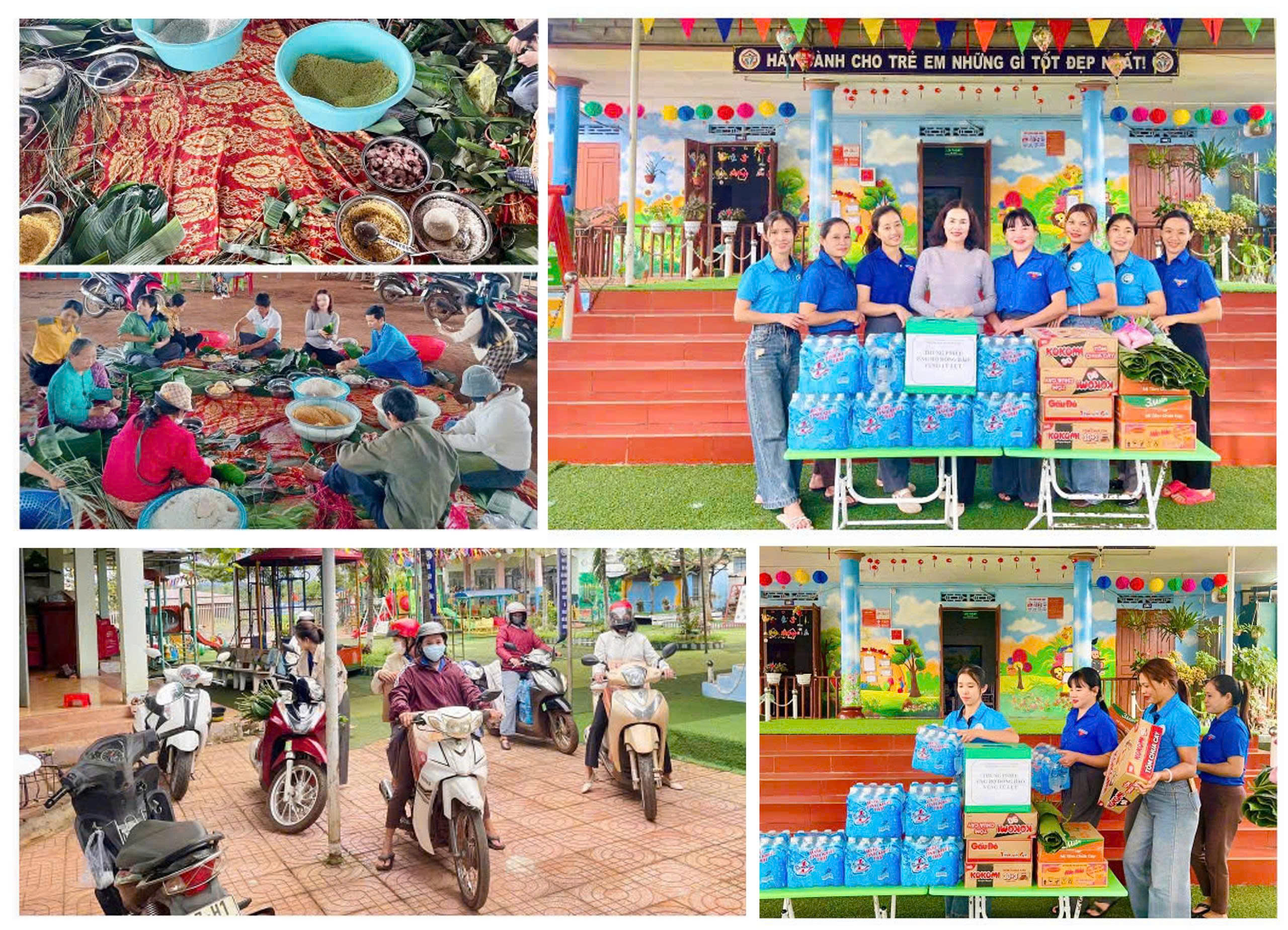 Không chỉ vận động quyên góp vật chất, Đoàn Thanh niên Trường Mẫu giáo Hoa Sen còn tham gia hoạt động gói bánh chưng tại điểm gói bánh thôn Hiệp Hưng. Những chiếc bánh chưng xanh được gói cẩn thận, chứa đựng tấm lòng sẻ chia, đã góp phần tiếp thêm bữa ăn ấm áp cho bà con đang gặp khó khăn.